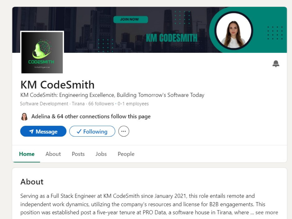 As a Full Stack Engineer at KM CodeSmith since January 2021, I specialize in remote and independent work, utilizing company resources for B2B engagements, following a significant five-year stint at PRO Data and two years at Albania Petrolium LTD where I developed a wide array of skills in web and mobile development.